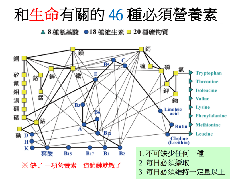 根據最新的生化研究,人生存所需的營養有46種,包括8種必須氨基酸、18種維他命及20種礦物質,全部都不能在體內合成或貯藏,必須每天由食物中攝取,更重要的一點是其中任何一種缺乏,就會發生代謝異常而生病。
